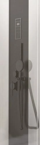 - Toit en verre trempé 5mm extra blanc avec pomme de tête ronde Ø200mm, un extracteur de vapeur, un spot LED et un haut parleur.