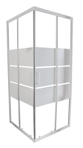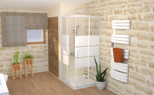 - 2 volets coulissants et 2 panneaux fixes en verre trempé 4 mm avec sérigraphie 3 bandes peintes blanches.