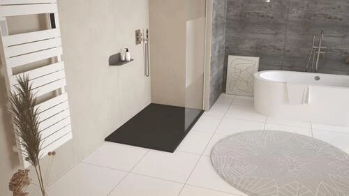 - Receveur 80 x 120 cm extra-plat 3 cm en résine de synthèse noire, sans ressaut à encastrer et recoupable pour une installation sur-mesure grâce à sa fabrication en composé mixte résine et