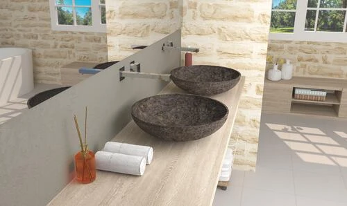 - Vasque noire en Terrazo constitué d’un mélange de ciment et de résine avec du marbre concassé de grosseur et texture variables suivant l’aspect désiré.
